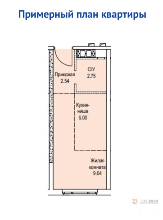 Площадь: общая ~ 19.3 м2, жилая ~ 9 м2, кухня-ниша ~ 5 м2.