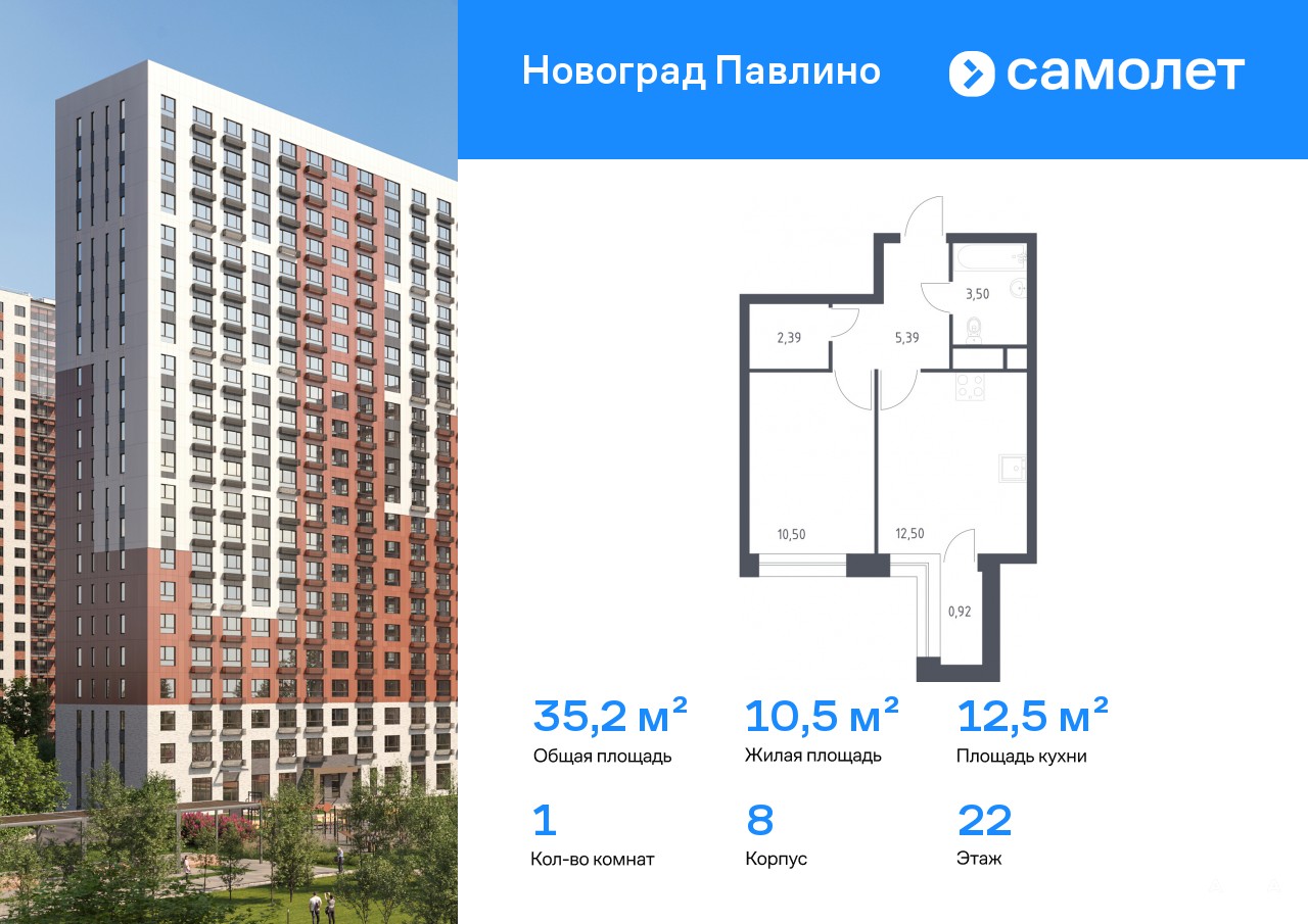 Предлагается 1-комнатная квартира комфорт-класса 35, 2 кв.м в корпусе 8 на 22 этаже, в ЖК «Новоград Павлино»
