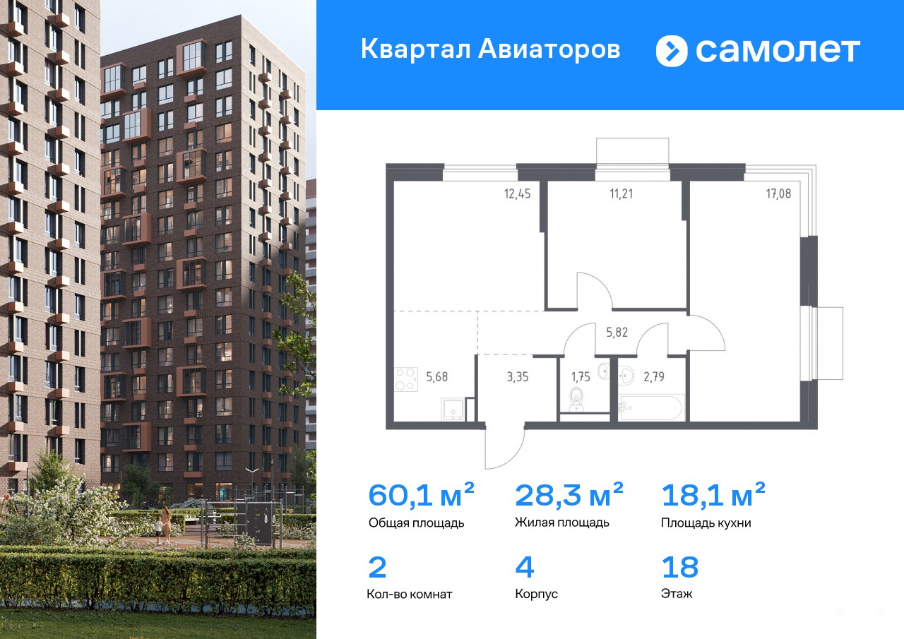 Предлагается 2-комнатная квартира комфорт-класса 60, 13 кв.м в корпусе 4 на 18 этаже, в ЖК «Квартал Авиаторов»