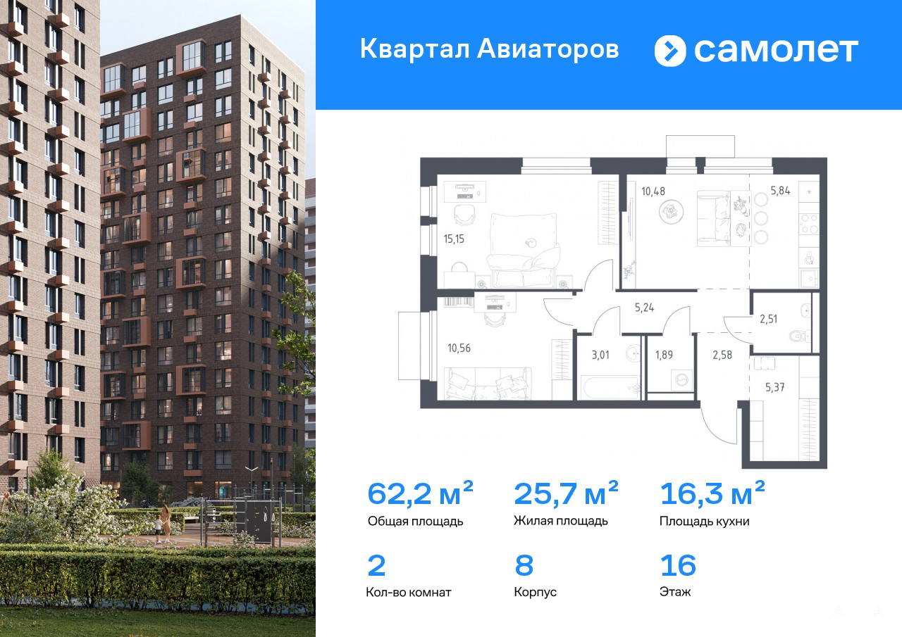 Строим кварталы для жизни с заботой о будущем. Предлагается 2-комнатная квартира комфорт-класса 62, 2 кв.м в корпусе 8 на 16 этаже, в ЖК «Квартал Авиаторов»
