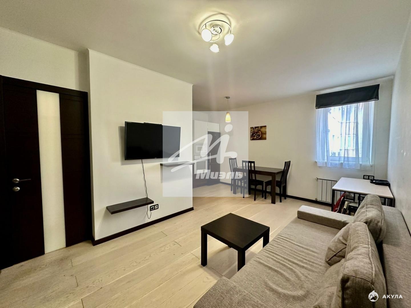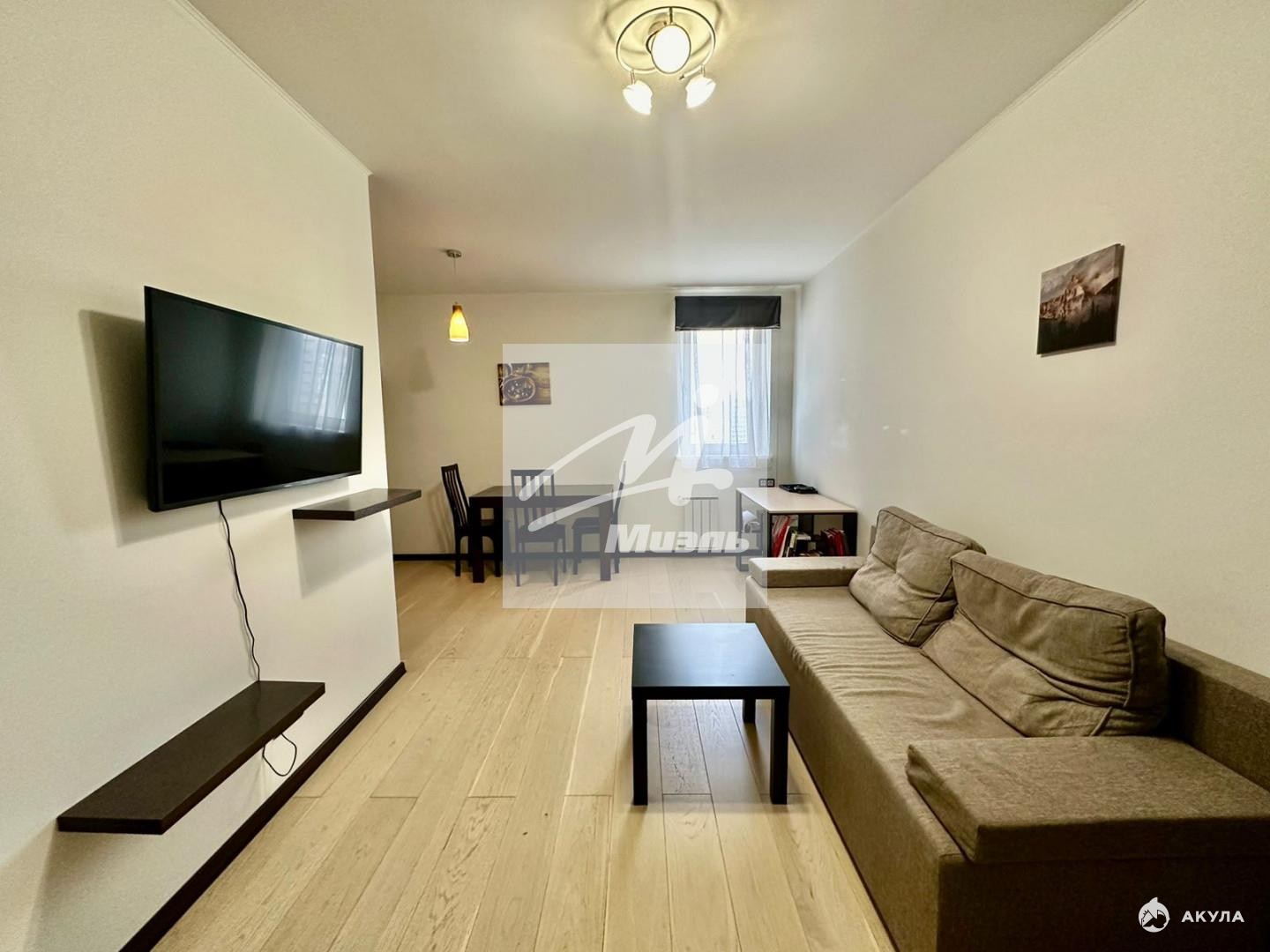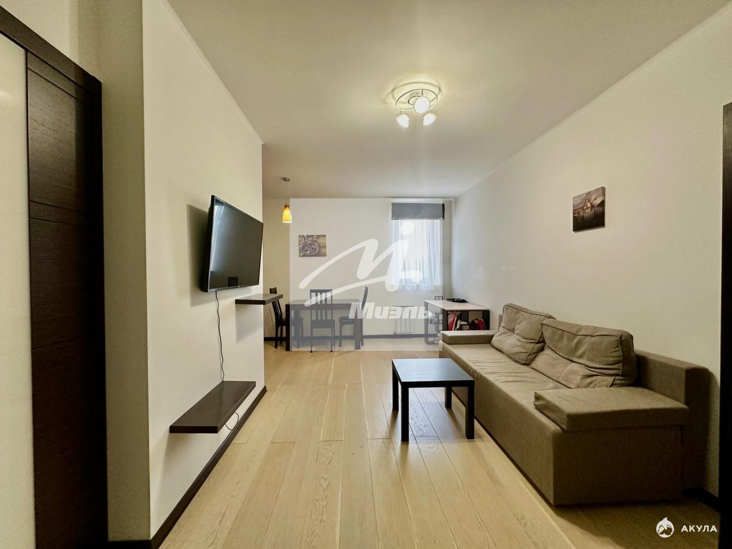 В гостиной раскладной диван, обеденная зона и огромный телевизор.